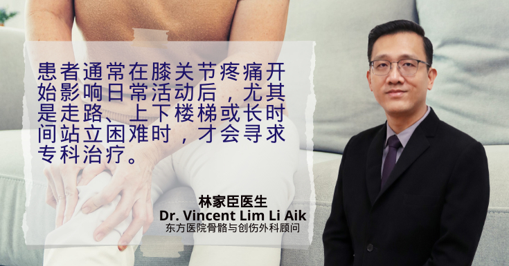 东方医院骨骼与创伤外科顾问林家臣医生( Dr. Vincent Lim Li Aik )指出,许多患者往往在膝盖关节疼痛已经严重影响日常生活,尤其是走路膝盖痛、上下楼梯吃力,长时间站立也变得困难,才前来求医。